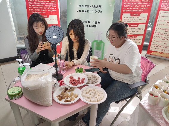 活动现场,她们带着头皮护理产品和家乡大米进行现场展销,同时以微信视频号和抖音平台直播的形式,在线展示和销售上海本地农产品和特色糕点,这些商品都是经过严格选品的,其中来自浦东新区的三林崩瓜凭借“肉嫩多汁”和独特的奶香味成为了当之无愧的人气王。活动现场聚集了很多师生,主播们现场一一讲解当天展示的商品。