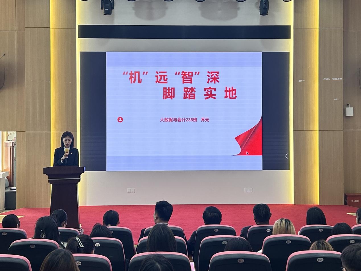 接下来,会计235班学生乔元同学作为2024年度学风建设“十佳优良学风班”代表进行交流发言,她从班级的学习氛围营造、学习方法交流、同学之间的互助合作等方面分享了该班级在学风建设中的宝贵经验。