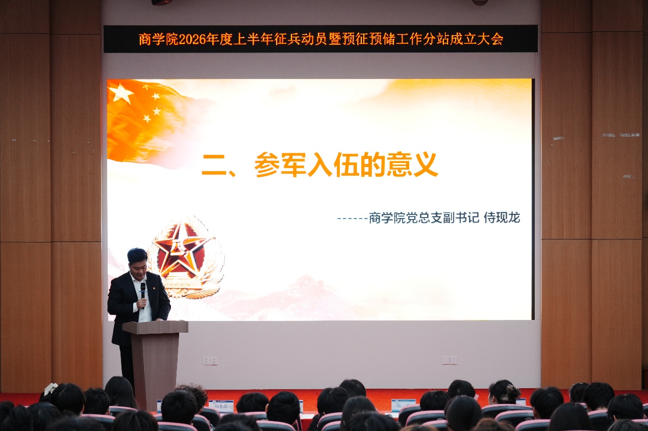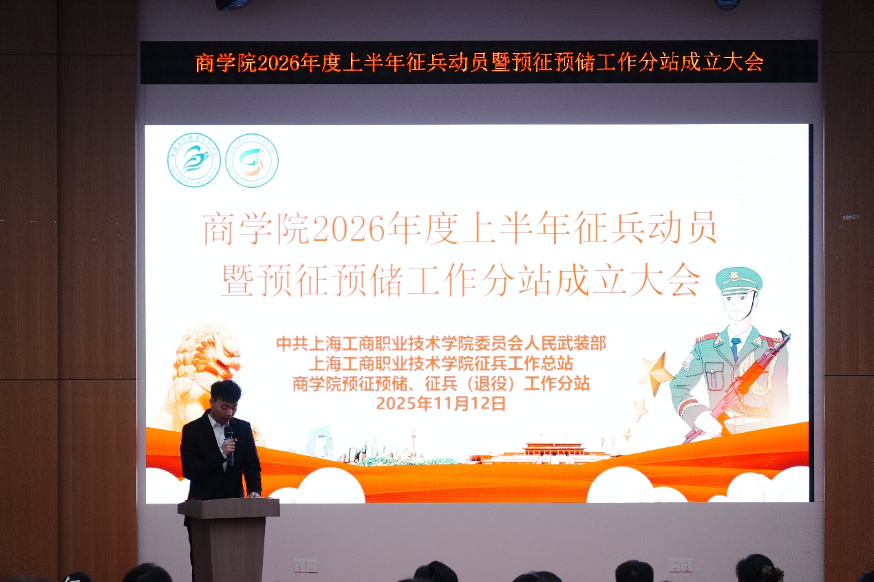 为积极响应国家征兵号召,激发广大学子投身国防、报效祖国的热情,扎实推进学院征兵工作,上海工商职业技术学院必赢电子游戏网站于2025年11月12日下午在青浦校区报告厅举行2026年度上半年征兵动员暨预征预储工作分站成立大会。必赢电子游戏网站党总支书记陈其、党总支副书记侍现龙、学校征兵宣教组组长张敏、学院征兵工作分站站长兼预征预储工作分站站长田园、全体辅导员及有志参军学子齐聚一堂,共同见证了这一重要时刻。