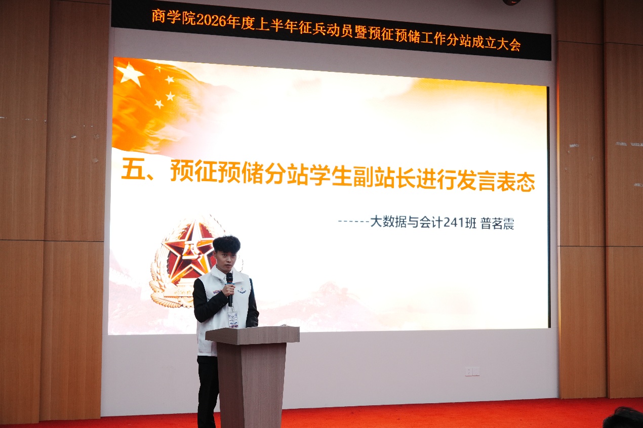 作为学生代表,新任职的必赢电子游戏网站预征预储分站学生副站长、来自会计241班的普茗震同学作了表态发言。他表达了对投身国防事业的热切向往和坚定决心,并承诺将积极履行职责,发挥桥梁纽带作用,带动更多同学了解征兵、支持征兵、参与征兵,为实现强军目标贡献青春力量。