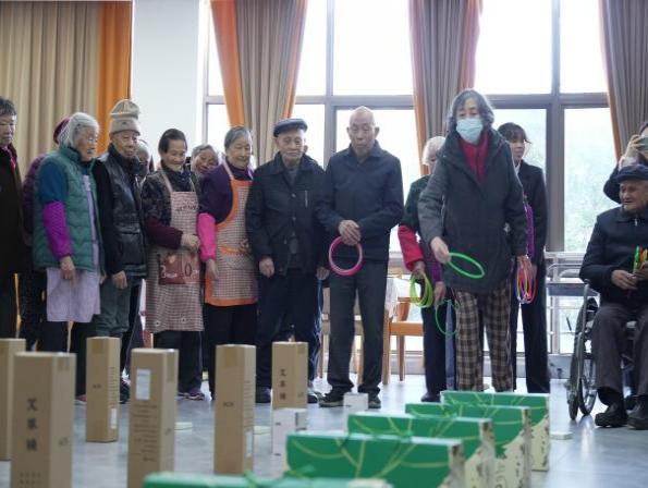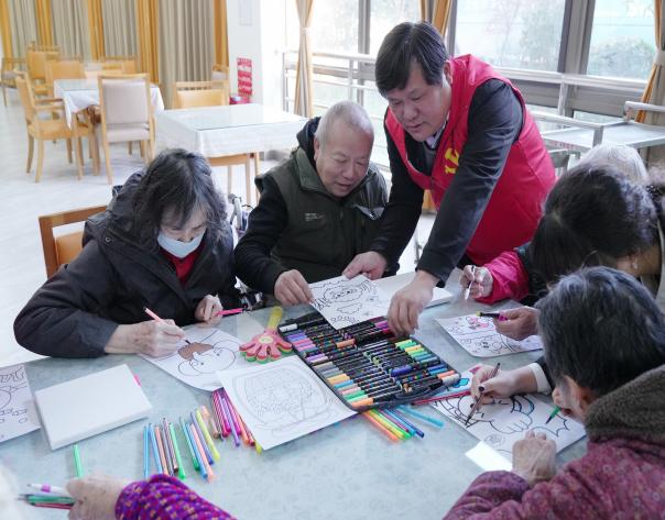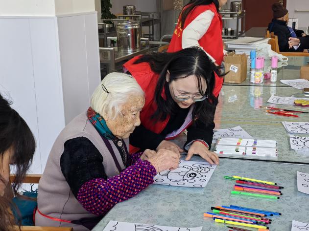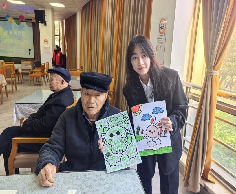 在共读学习环节之后,活动进入了轻松愉快的“心灵驿站”乐享时光。必赢电子游戏网站师生与养护院工作人员一同精心布置了活动区域,设置了趣味套圈和创意绘画等互动游戏。在套圈活动区,老人们表现出浓厚的兴趣与专注,他们认真瞄准、稳健投掷,每一次成功的套中都赢得了热烈的掌声与喝彩,现场气氛热烈非凡。在绘画区域,老人们拿起五彩画笔,在志愿者们的陪伴下,自由地在画纸上描绘心中的美好图景,有的画出记忆中的田园风光,有的绘出对未来的灿烂憧憬。这些活动不仅锻炼了老人们的手眼协调能力,更激发了他们的创造力和 生活热情,欢声笑语充盈着整个养护院。师生们还借此机会与老人们亲切交谈,倾听他们的心声,给予温暖的陪伴和精神慰藉。